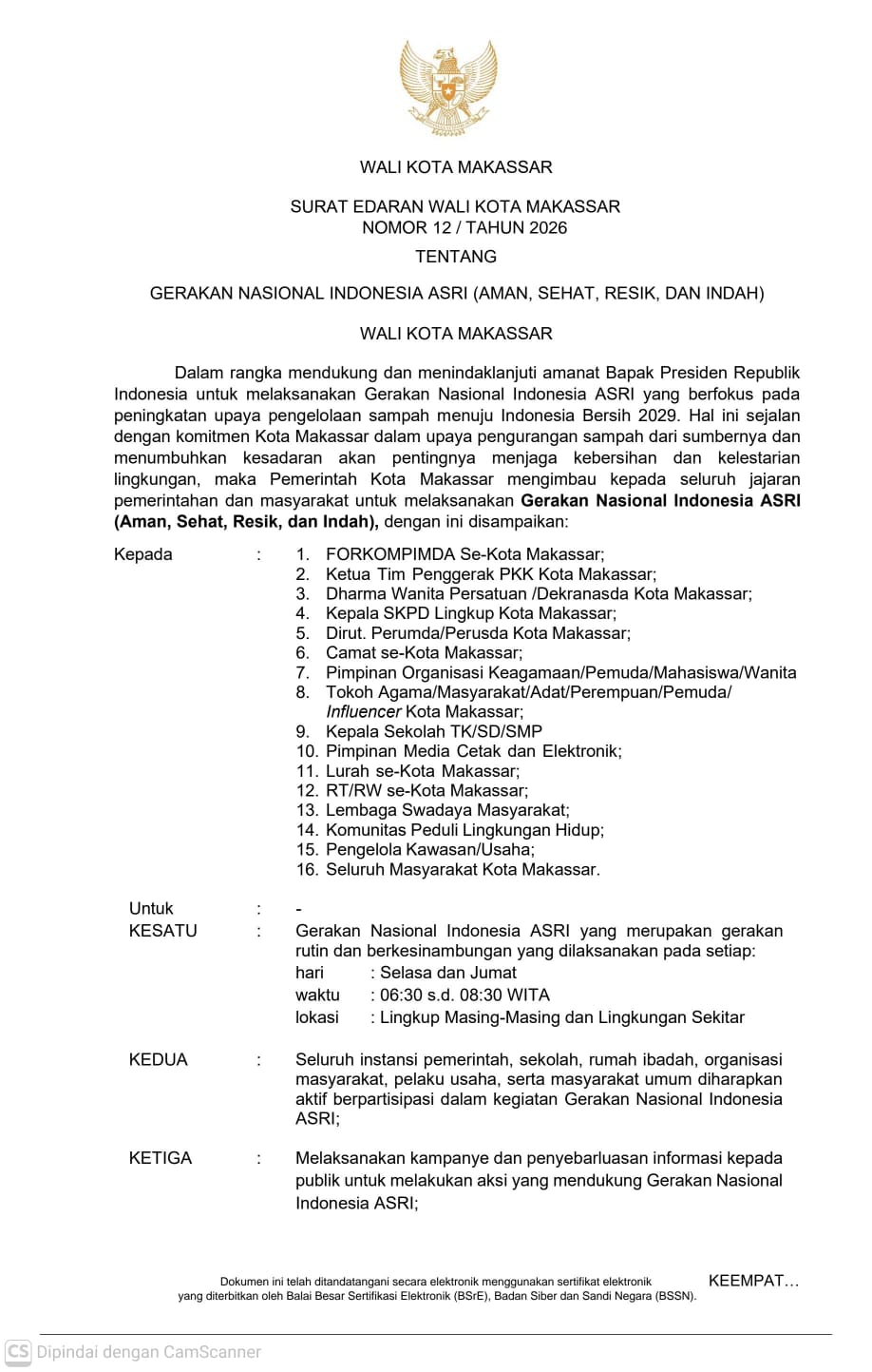 MAKASSAR — Wali Kota Makassar, Munafri Arifuddin, resmi menerbitkan Surat Edaran (SE) Nomor 12 Tahun 2026 tentang Gerakan Nasional Indonesia ASRI (Aman, Sehat, Resik, dan Indah).