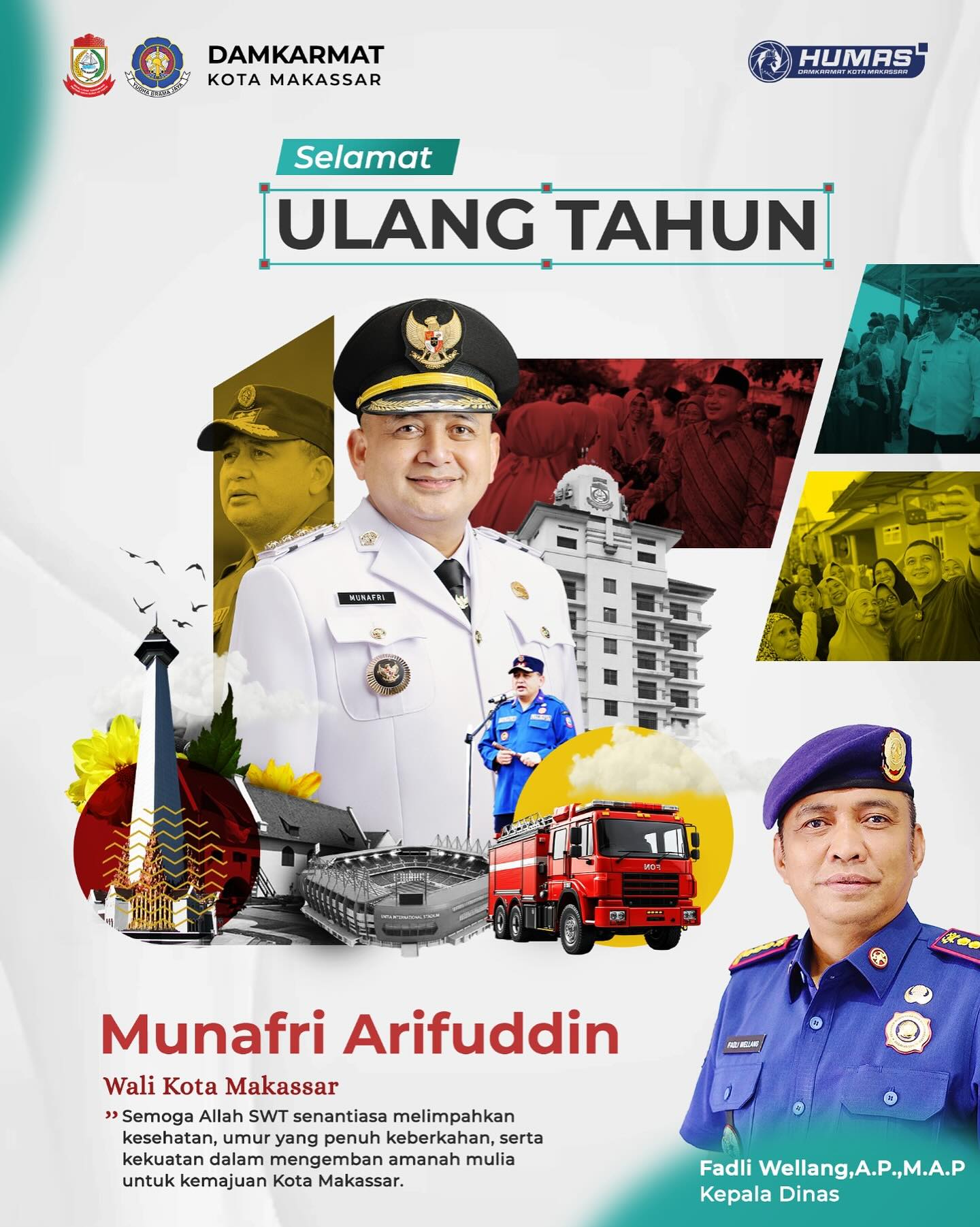 Dinas Pemadam Kebakaran dan Penyelamatan Kota Makassar mengucapkan Selamat Ulang Tahun kepada Bapak Wali Kota Makassar, Munafri Arifuddin, S.H,” tulis akun media sosial Dinas Damkarmat Makassar, Sabtu 20 September 2025.