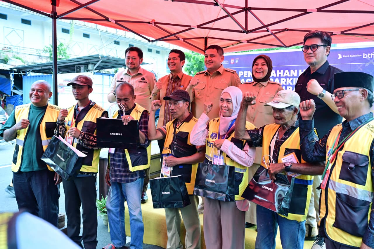 Makassar — Perumda Parkir Makassar Raya bersama Bank Indonesia (BI) Perwakilan Provinsi Sulawesi Selatan serta mitra perbankan nasional—Bank Sulselbar, Bank BTN, dan Bank Mandiri—menggelar kegiatan penyerahan hadiah bagi para juru parkir yang berprestasi dalam penerapan pembayaran parkir digital (QRIS).